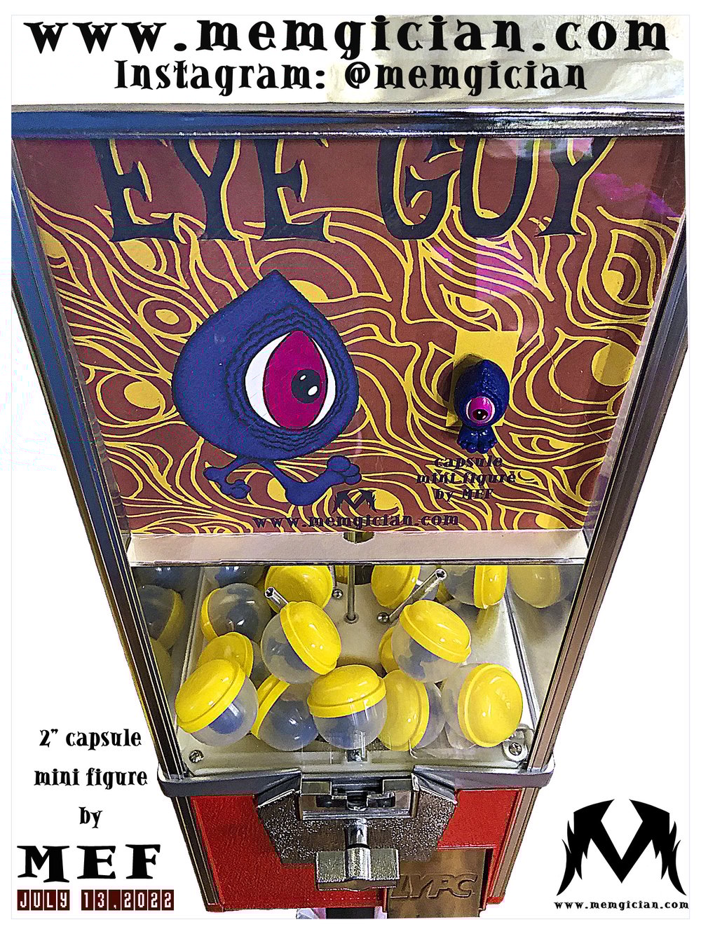 No Coast Art Wizard Michael French (MEF) has created the Eye Guy mini figure to help you deal... or send you over the edge. The Eye Guys are kept in a Toy Vending Machine until they are ordered and are delivered in a capsule to you. Keep them trapped inside, or open it for a staring contest: You decide!